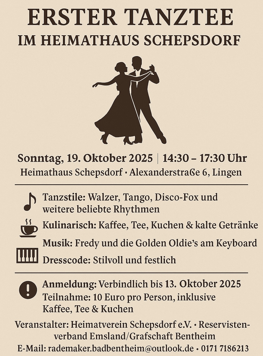 Am Sonntag, den 19. Oktober 2025, von 14:30 Uhr bis 17:30 Uhr verwandelt sich das Heimathaus Schepsdorf, Alexanderstraße 6, in Lingen, in eine festliche Tanzarena für alle Tanzbegeisterten.
