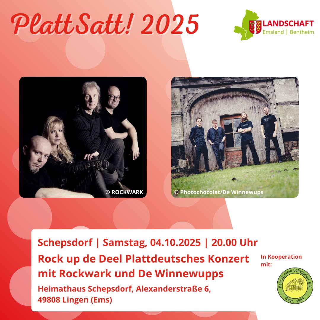 Im Heimathaus Schepsdorf wird es laut: Rockwark und De Winnewupps verwöhnen in einem Doppelkonzert die Ohren mit Rock und Metal up Platt. ROCKWARK ist es wichtig, dass PLATT einfach da ist – überall. ROCKWARK macht keine plattdeutsche Musik, ROCKWARK macht Hardrock mit plattdeutschen Texten, ganz so, wie es auch zu Hause gesprochen wird, in der eigenen Muttersprache.