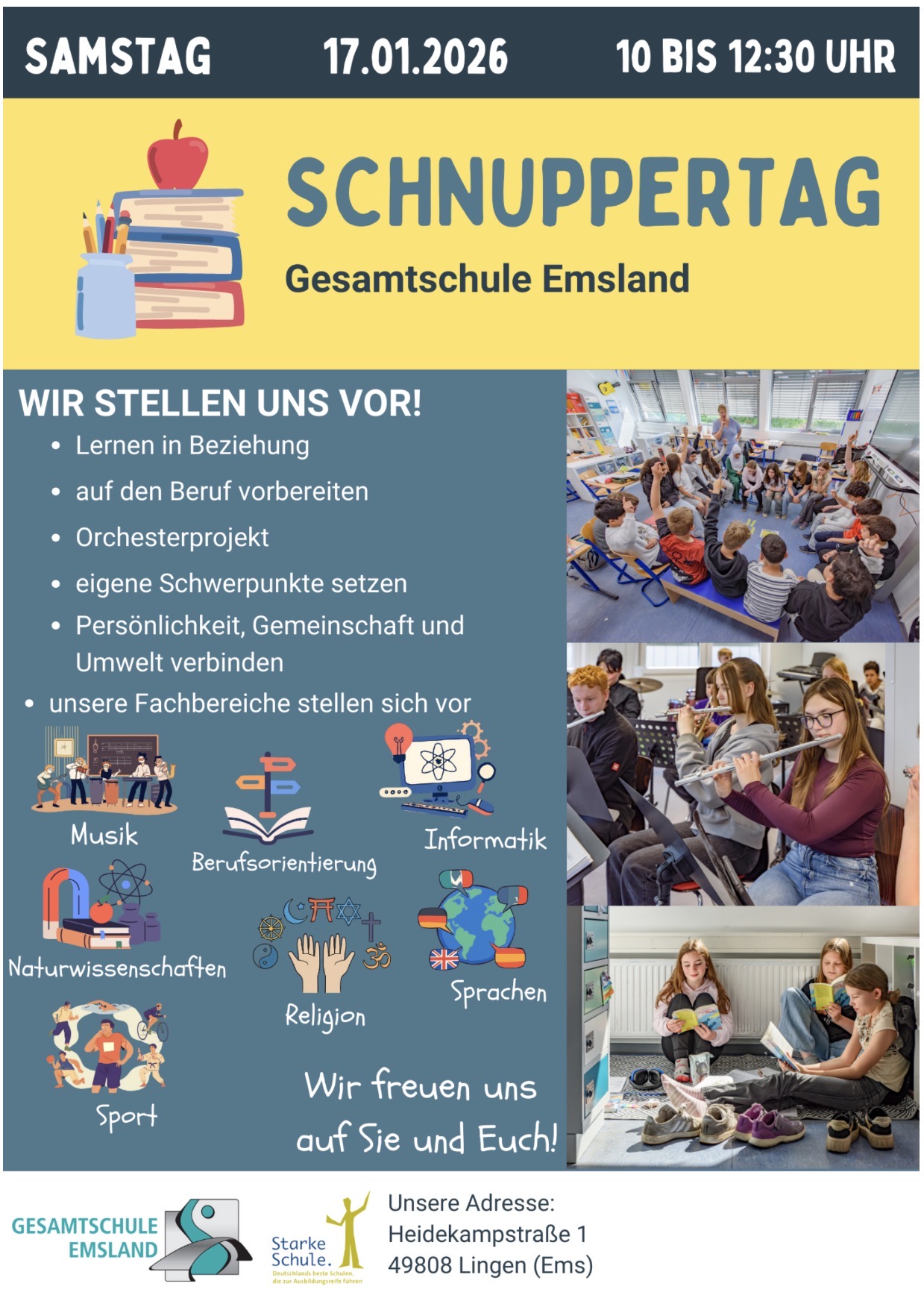 Die Gesamtschule Emsland freut sich auf viele neugierige Kinder, interessierte Eltern und einen Vormittag voller Begegnungen, Eindrücke und Gespräche. Vorbeikommen lohnt sich – denn Schule beginnt mit einem guten Gefühl.