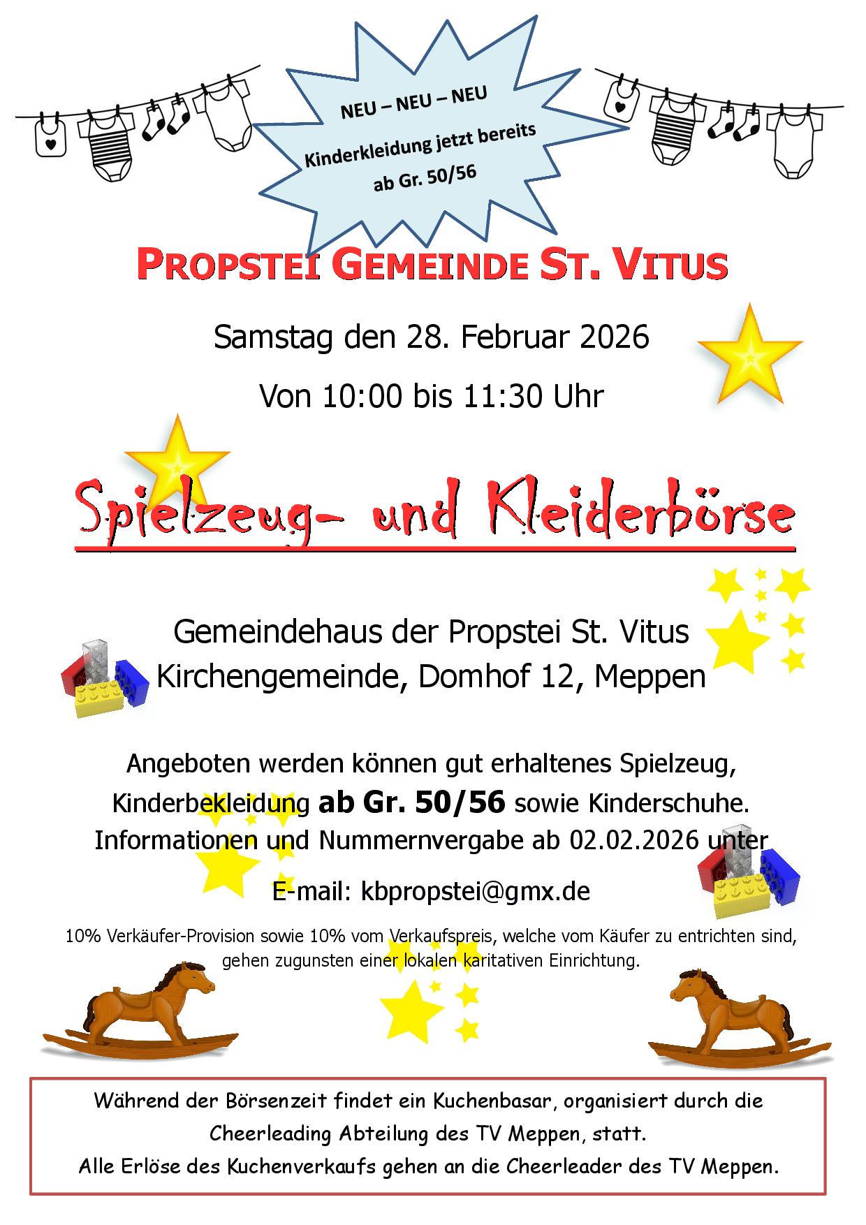 Am Samstag, den 28.02.2026 findet in der Zeit von 10:00 – 11:30 Uhr eine Spielzeug- und Kleiderbörse im Gemeindehaus der Propstei St. Vitus Kirchengemeinde, Domhof 12, Meppen statt. Angeboten werden Frühlings- und Sommerkleidung für Kinder ab Größe 50/56, gut erhaltene Kinderschuhe sowie diverse Spielzeuge, Babyartikel, Kinderfahrzeuge, etc. Einlass für Schwangere bereits 15 Minuten vor Beginn der Börse. Alle Helferinnen und Helfer sind ehrenamtlich und unentgeltlich tätigt. Die erzielten Erlöse gehen vollständig zugunsten lokaler, gemeinnütziger Einrichtungen. Während der Börsenzeit erfolgt ein Kuchenverkauf durch die Cheerleader des TV Meppen.